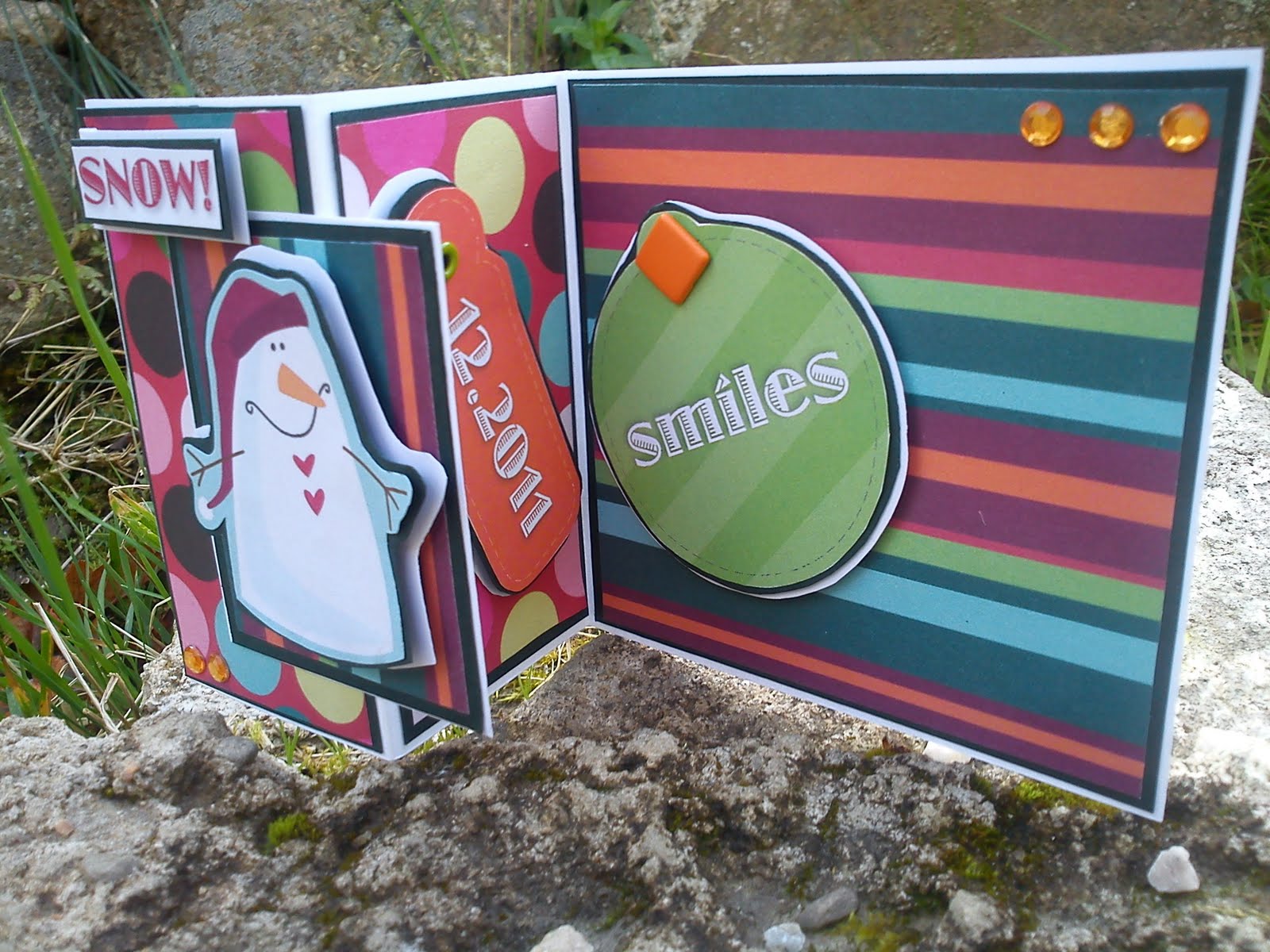 Here I have tried to do a clean cut card again, and this one I am entering in Magical Monday Challenge. The theme is Christmas in September. I have used white and dark green card stock from the Paper Mill in Aberdeen. The papers are designed by Emma Schonenberg. The snow man image and tags and sentiment, were all matching cutouts from the same paper range. The bling is from Hobby craft and the brad was from stash. Cut the "smiles" bauble and attached the brad so that you can slide up and write your chrismas message in. Thanks for popping by. :)